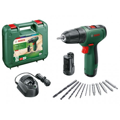 • Аккум. дрель-шуруповерт BOSCH EasyDrill 1200 в чем. + набор сверл и бит (12.0 В, 2 акк., 1.5 А/ч Li-Ion, 2 скор., 30 Нм, шурупы до 6 мм)